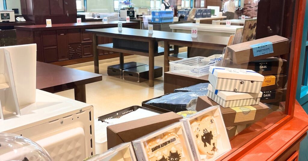 ガラス越しに見える工房には、色とりどりのチョコレートやデコレーションされたクッキーのサンプルが飾られていて、見るだけでもワクワクしました!